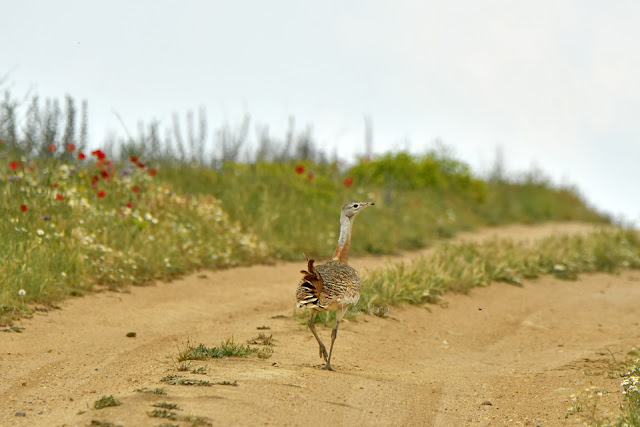 El plan es ir pateando caminos secos y polvorientos. Y como la zona es amplia es aconsejable pasearlo con un vehículo todo terreno o lo más parecido, aunque un tractor es lo mejor para acercarse a esas aves reinas de la estepa - desconfiadas cada vez más dado la globalización por la que ya no disponen de un palmo cuadrado de privacidad, ya que una cosa es visitarlas y verlas y otra atosigarlas..... Ya expliqué que, ya localizadas en grupo , me asiento en un punto dominante y cuando los imprudentes las van espantando yo recojo sus vuelos sin molestarlas.